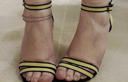 Per mantenere lo stile anni 80 ho abbinato un paio di sandali con stiletto alto e con cinturino alla caviglia dove spicca il giallo fluo come unica nota colorata di tutto l’outfit.