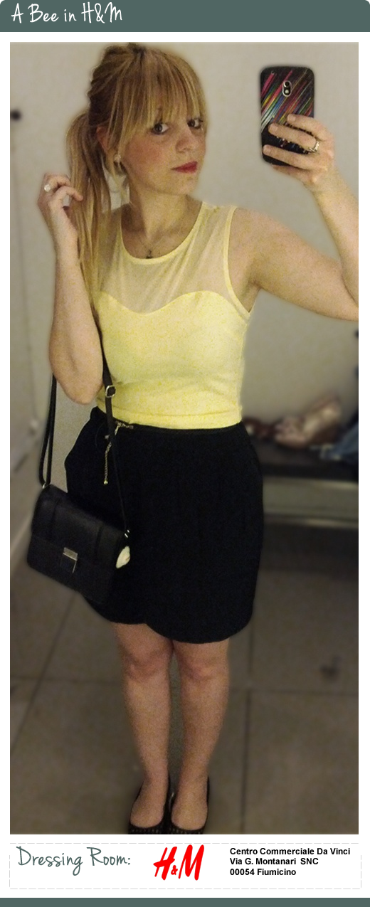 Sempre tra i nuovi arrivi ho scelto una canotta di cotone gialla con decolletè di tulle,ballerine nere traforate e una borsetta stile scolaretta.