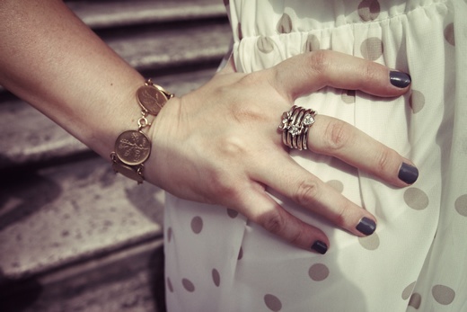 Per questa passeggiata tra Piazza del Popolo e Piazza di Spagna ho scelto un outfit comodo e leggero costruito attorno a un vestitino bianco a pois beige di Stradivarius che si presenta accollato e con un elastico sotto il seno. Ho abbinato una borsa marrone Segue e sandali bassi di cuoio marroni con laccio alla caviglia. Dettaglio particolare è il braccialetto vintage artigianale realizzato con delle vecchie 20 lire che mio padre regalò a mia madre durante il fidanzamento.