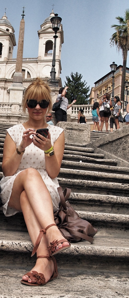 Per questa passeggiata tra Piazza del Popolo e Piazza di Spagna ho scelto un outfit comodo e leggero costruito attorno a un vestitino bianco a pois beige di Stradivarius che si presenta accollato e con un elastico sotto il seno. Ho abbinato una borsa marrone Segue e sandali bassi di cuoio marroni con laccio alla caviglia. Dettaglio particolare è il braccialetto vintage artigianale realizzato con delle vecchie 20 lire che mio padre regalò a mia madre durante il fidanzamento.