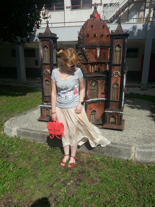 Together with the skirt I wore brown sandals and a t-shirt with the fashion bunnies of the famous blogger Fifi Lapin, as accessories a gold pink digital clock by Asos, sunglasses Zara, gold ring with stone brown H & M and bracelets by Bijou Brigitte. To complete the outfit a small shoulder bag coral by Avon.