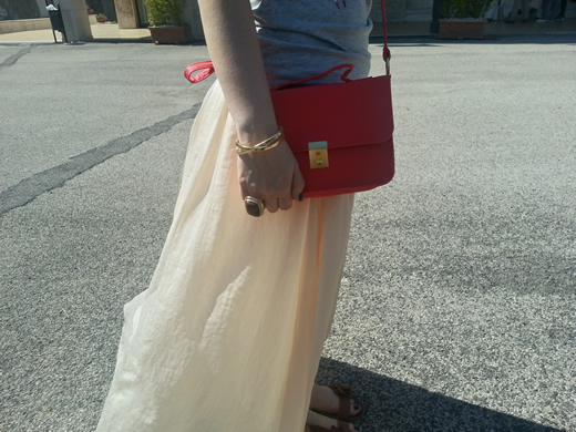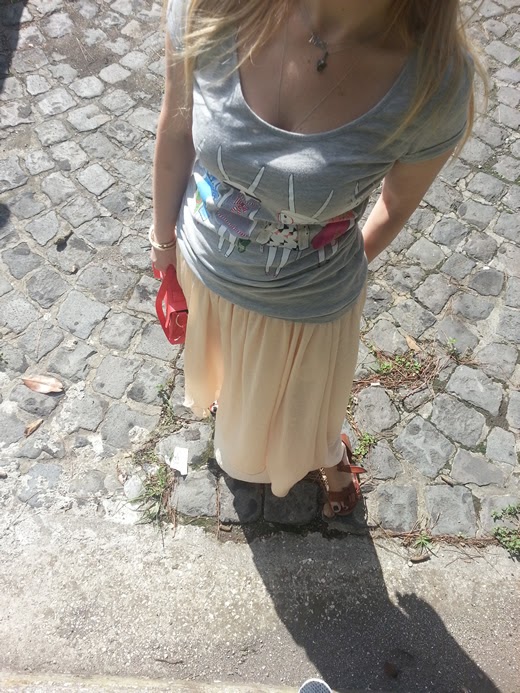 Insieme alla gonna ho indossato dei sandali bassi marroni e una tshirt con le fashion conigliette della famosa blogger Fifi Lapin, Come accessori un orologio digitale oro rosato Asos, degli occhiali da sole cipria Zara, anello oro con pietra marrone H&M e bracciali Bijou Brigitte. Per concludere l’outfit una piccola borsa corallo a tracolla Avon.