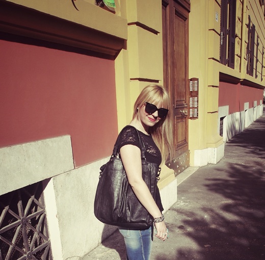Per l’occasione ho scelto un outfit semplice e coerente con il clima quasi estivo di questo fine ottobre composto da un top peplo macramè nero di Pull&Bear,  jeans skinny Kate London e slippers nere con borchie Gold&Gold. Come accessori una borsa nera di Segue, un anello con rosa di Bijou Brigitte, un bracciale con catena e un anello con segno zodiacale (Leone, il mio!)  H&M.