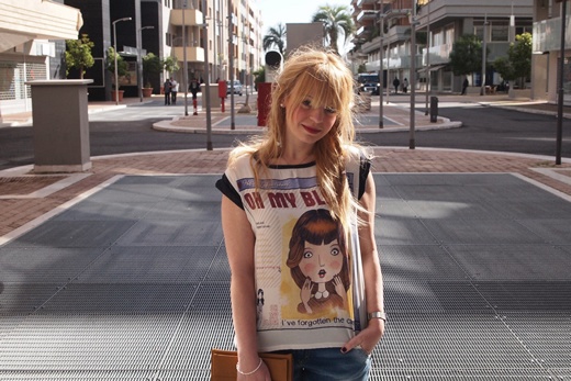 Per l’occasione ho indossato una Tshirt Pull&Bear panna e nera con disegno (ogni riferimento è puramente casuale), dei jeans skinny Kate London e delle ballerine bordeaux con punta in acciaio Gold&Gold, una handbag beige Avon accompagnata da un bracciale argento Bijou Brigitte e tre piccoli anelli argento Pimkie.