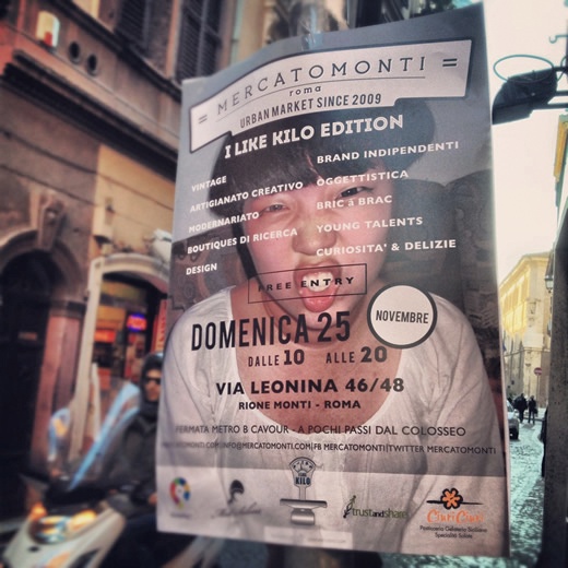 Domenica 25 novembre sono andata a fare una capatina al famoso urban market sito nel rione Monti a Roma: il Mercatomonti. Il mercato è sempre stato un punto di riferimento per l’acquisto di capi vintage o di accessori particolari realizzati da designer poco conosciuti ma quello che mi ha convinto ad andare è stata la presenza di un vasto stand dedicato a I Like to Kilo. I Like to Kilo offre la possibilità di acquistare i capi “al Kg”, mi spiego meglio, 1 Kg di abiti (qualunque essi siano) costa 15€. Una volta scelti i vestiti vengono pesati con una bilancia extralarge e stabilito l’importo in base al peso. Di abiti interessanti ce ne erano ma sfortunatamente non della mia taglia il che mi ha lasciato con un pugno di mosche subito sostituito da uno splendido maglioncino bianco con fiocco e teschi acquistato all’ultimo secondo prima di andare via che indosserò in uno dei prossimi outfit!