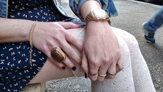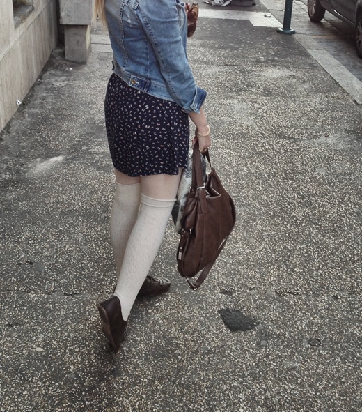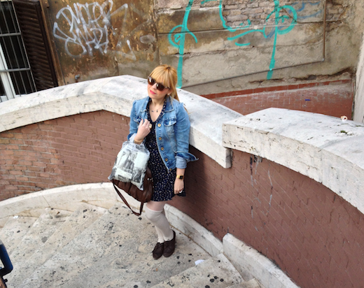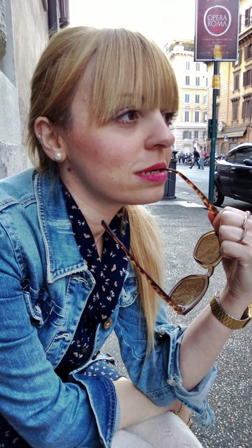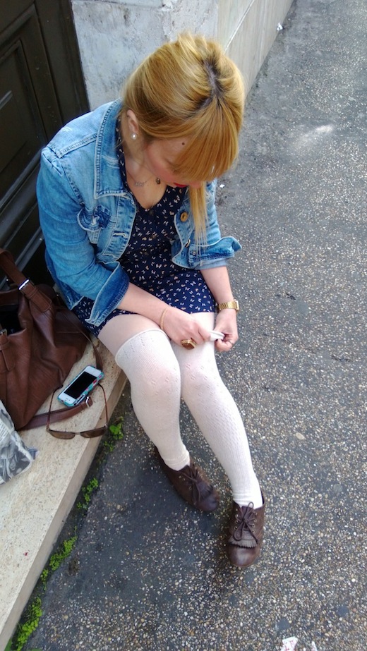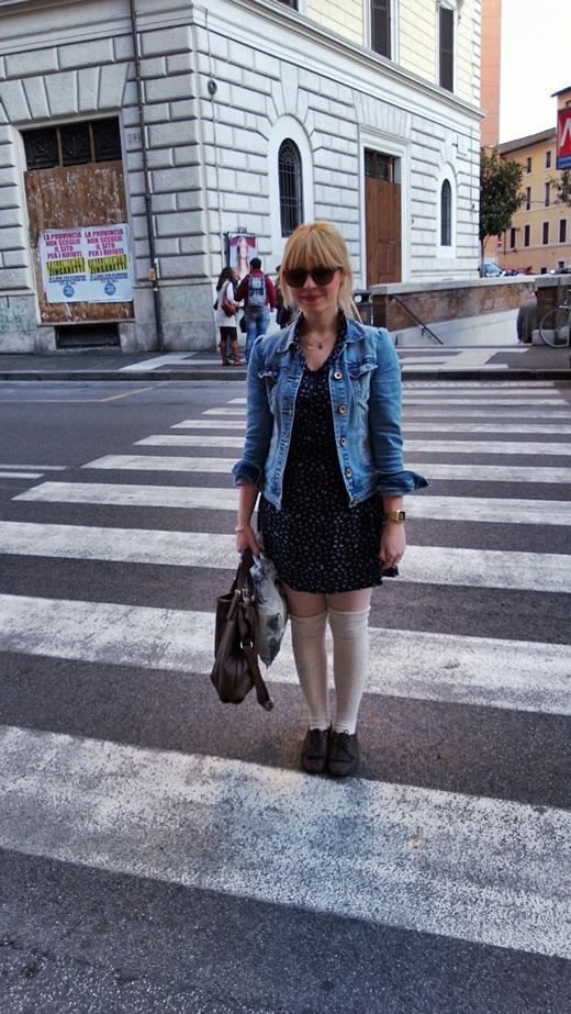Per questa passeggiata nel centro della capitale ho scelto un vestitino blu disegnato Pimkie, delle calze avorio con parigine Calzedonia e un giacchetto jeans Bershka. Come scarpe ho scelto un paio di derby marroni Pull&Bear mentre per gli accessori una shopping bag marrone Segue, degli occhiali Six, un anello oro con pietra marrone H&M e un bracciale Promod.