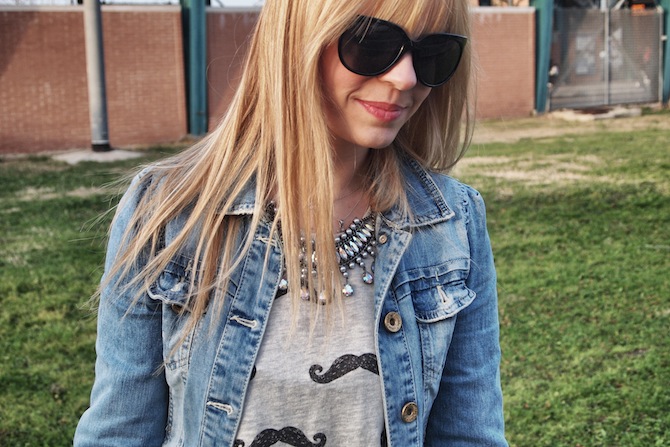 For this visit to the Befana in Piazza Navona I chose a gray sweatshirt with the now inevitable mustaches by Zara, a black peplum Zara and a jeans jacket Bershka. The shoes are the most desired short black boots with studs on the back Stradivarius and the only accessory was an important jewel necklace from H & M.