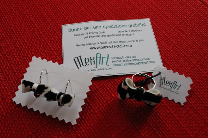 Insieme a questa talentuoso nuovo brand emergente romano abbiamo scelto per voi un regalo speciale: un twin set composto da anello e orecchini black and white con fiocco in ecopelle e in più uno speciale coupon che vi garantirà la spedizione gratuita per il prossimo acquisto nello store online di AlexArt!