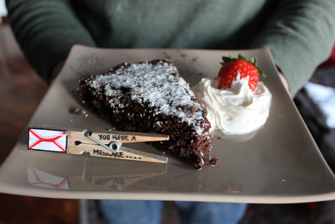 And then as tradition say I have prepared for him something very sweet … a cake accompanied by chocolate and coconut cream and strawberry.