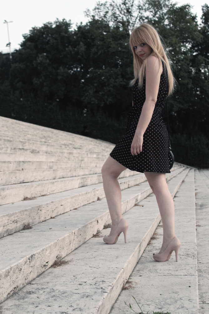 At least once in their lives, we thought of wanting to have the opportunity of living in a bygone era and try to understand aspects and sensations. And that’s what happened to me with this gorgeous dress with polka dots. Wear it catapulted me into a lighthearted, that straddles the late 50’s and early 60. A time that I adore so much and that made me feel like in one of those old black and white film shot in a deserted Rome in August. The retro flavor and the freshness of a light cotton, the detail of a soft belt at the waist and small powder pink polka dots are the protagonists of this new outfit thanks to Not Your Dolls, Roman brand of the young designer Paola Radishes that I think of considerable talent and with whom I have already worked in the past (see post HERE and HERE). To complete the look I chose to pair of earrings to match the polka dot, always Not Your Dolls and, to give a little futuristic touch, a double triangle necklace of Plastic Shock, made ​​entirely of plexiglass. The star sitting on the grand staircase of the Colosseo Quadrato with my thick glasses blacks gave me the boldness of a young lady of yesteryear that looks at the world from above, proud and confident.