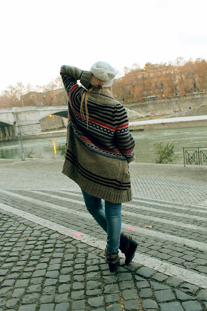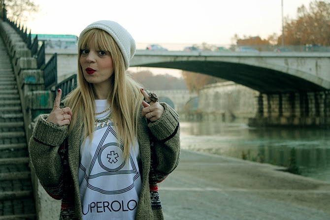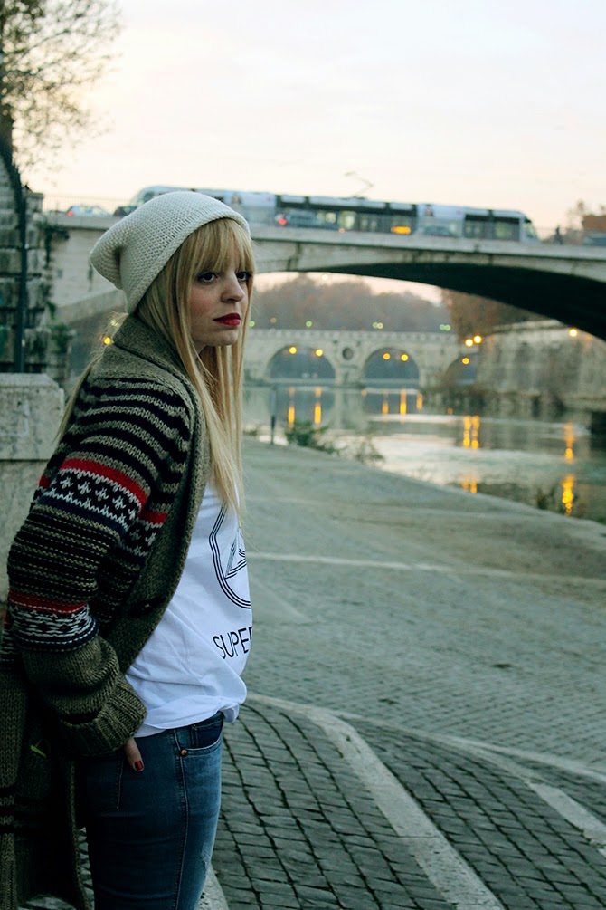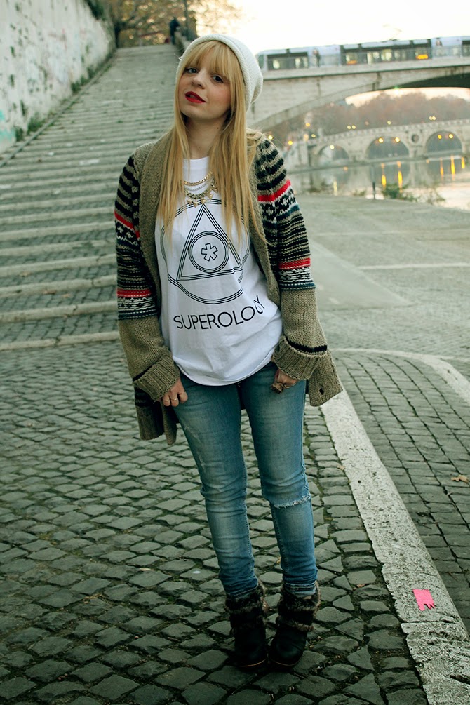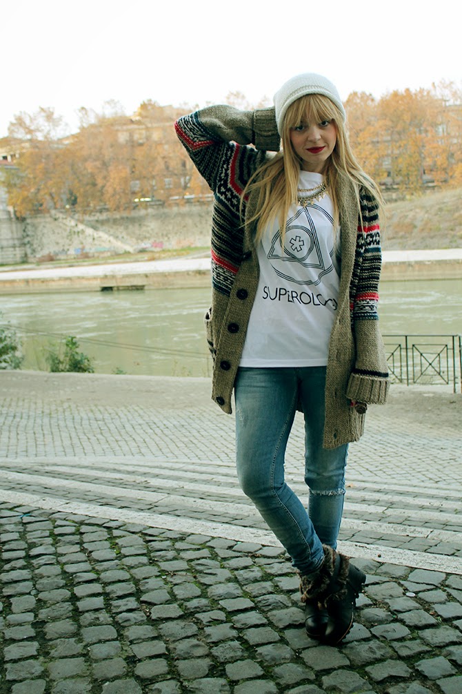 He knows it. He knows that during these months can happen that opening the cabinet he can not find it because I took it. I’m talking about my boyfriend’s sweater. A giant cardigan that covers me with warmth and softness. On days like these where the cold seems to be “under temporary control” I like to wear it with jeans and a t-shirt to stroll in peace and enjoy the sights of Rome. This time I chose for my outfit a really special tshirt, I came across this brand on the internet and I was fascinated.. and the fact that is based in Rome has impressed me even more. It is Superology. The fashion brand Made in Italy exists thanks to Vanja and Sarah, through the sharing of creative minds who are actively participating in the project, create a numbered and limited edition collections, starting from basic colors like black and white and inspired by Old School tattoos. Screen printing gives originality and authenticity to each model, making us super cool and glamorous. For a look like that I could only wear the ankle boots from the new collection by Sorel. Sorel offers comfortable shoes, wearable and chic without sacrificing protection. The new Joan of Arctic is an ankle boot with wedge heel that offers a few more inches in total comfort. The eco-fur embellishes these boots in leather and molded rubber sole and waterproof, perfect for the city to deal with the cold or rain. I’m literally in love. I love how comfortable these outfits , who remains with nothing is that lovely bearded patient boyfriend who regularly needs to revise its look.